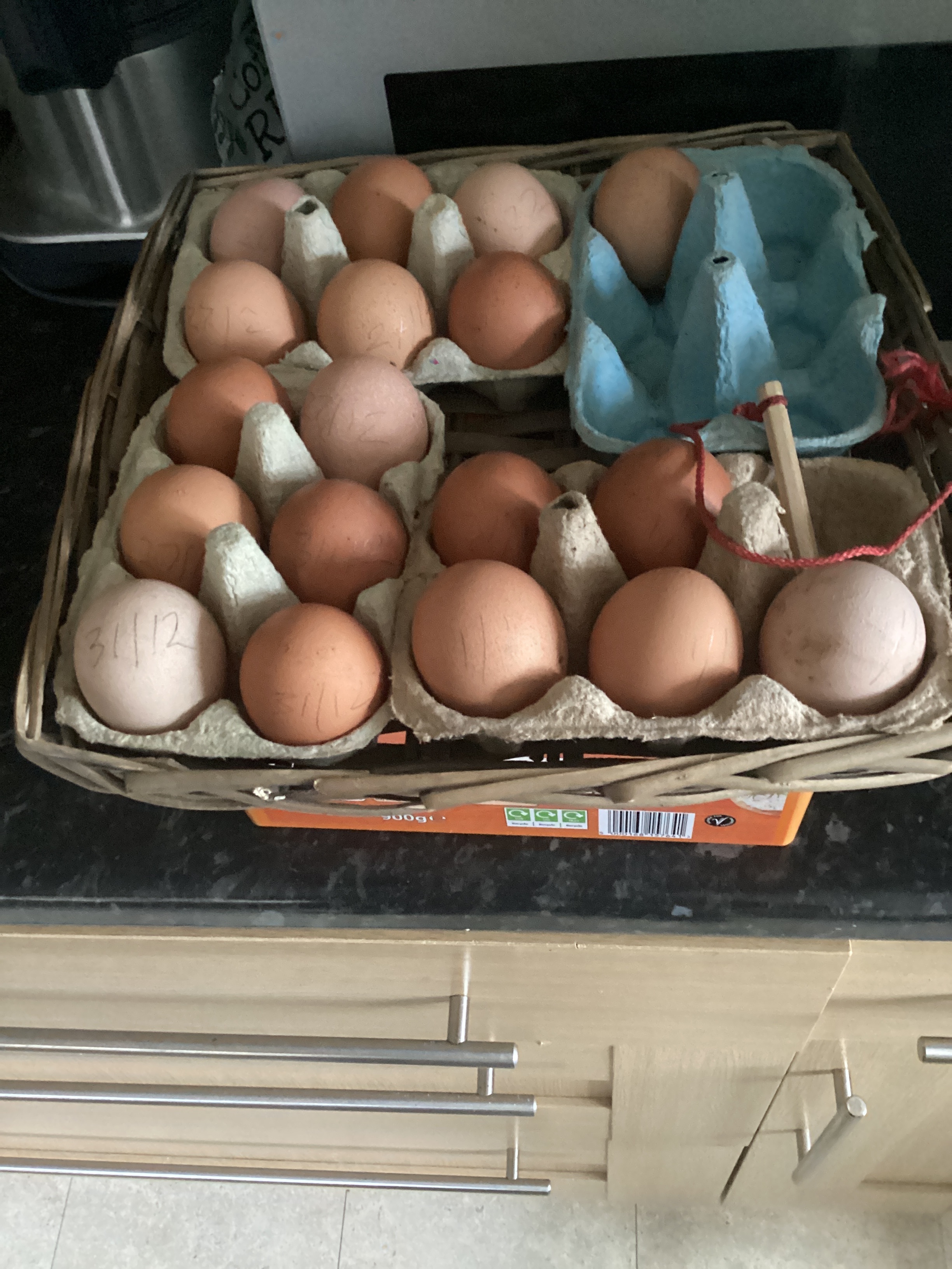 Not any old eggs but laid by our four girls . On egg flavour. Remember vividly the taste of eggs as a nipper, think battery eggs started in mid sixties, up till then all commercial eggs were free range grass grazing. On keeping our own , grass not practical so they have to be content with any greenery we give them . Access to the lawn is allowed at times but they seem to be escaping more and having a good time.