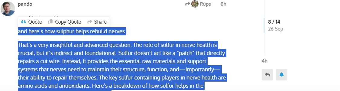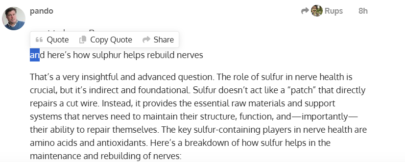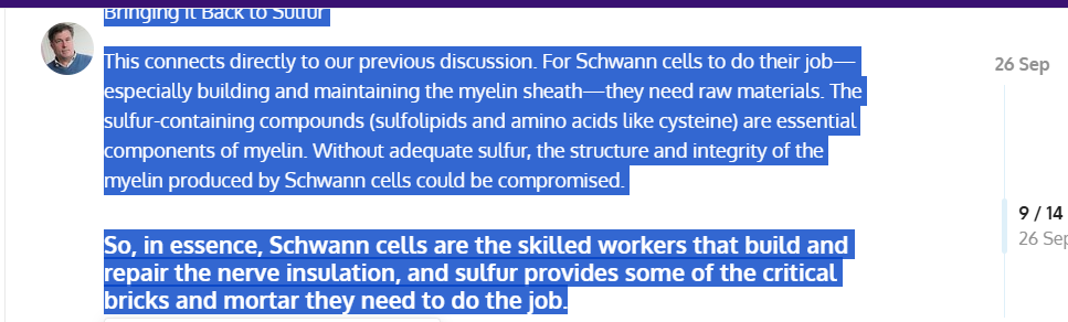 That’s just deep seek (AI) explaining how Sulphur helps nerves via Schwann cells (PNS) or in Rups’ case Oligodendrocytes (CNS)