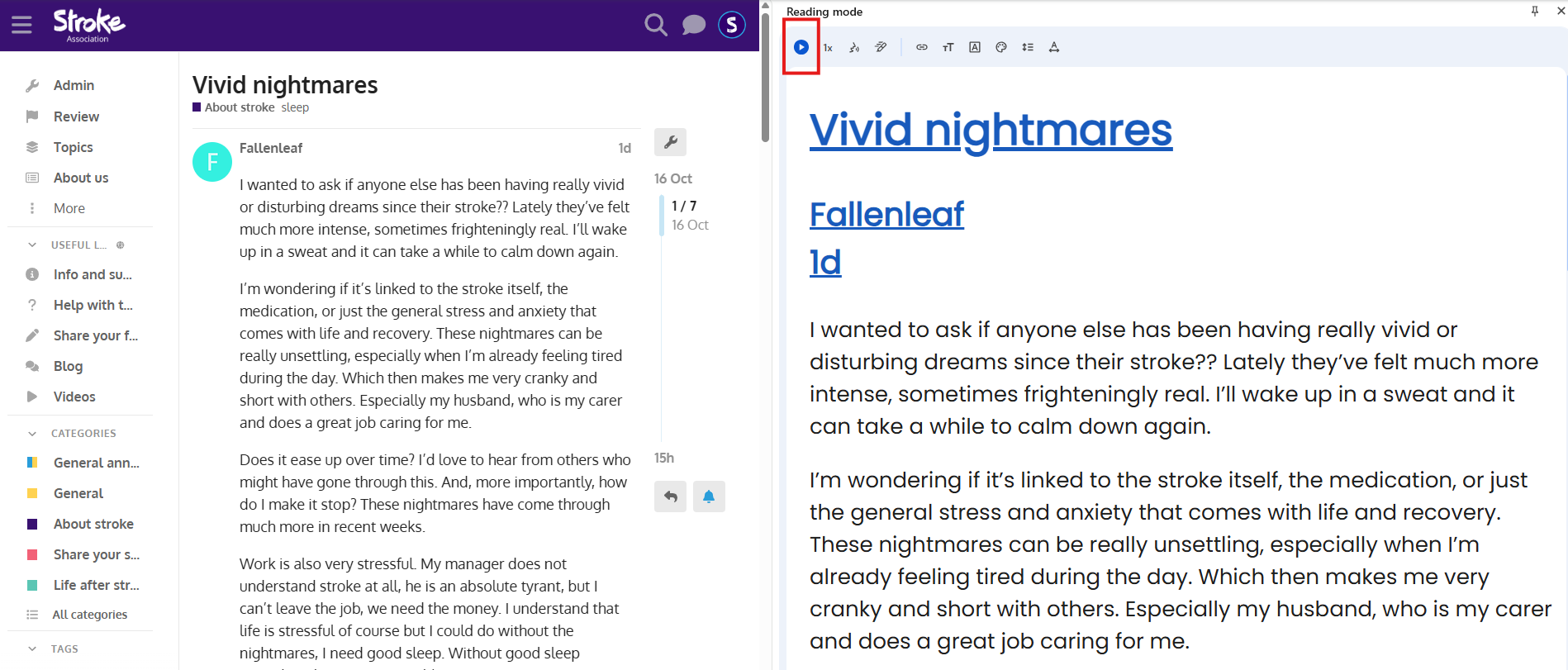 Unfortunately the Online Community doesn’t specifically have a read aloud option. However I have looked over a couple of different web browsers and have found some read aloud options on these. I’ve found these on Google and on Microsoft Edge. I’ve taken some screen shots of how to find these and put them below for you. These are for if you’re using the Online Community on a computer. On a phone these options are more limited, you could however temporarily turn on your phones in built ‘read aloud’ function which is usually found in the accessibility settings within your phone.