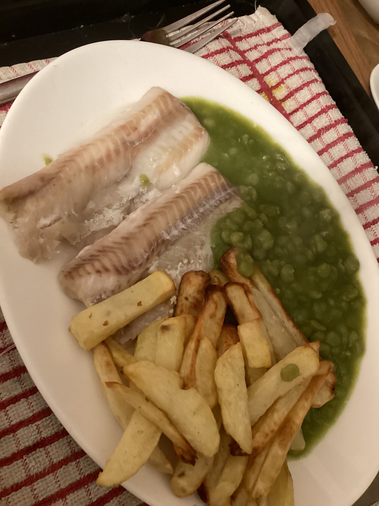 Ok definitely not fine dining🤣and not perfect yet. The chips were home cut very light drizzle of olive oil & cooked in air fryer. The fish Alaskan pollock (Tesco do pack of 5 at 2.30ish good price i think?). I think it would go well in a soup or pie/chowder or similar. The mushy peas ok I cheated but used up the last tin🤦♂️. Next time it’s ManjiB mushy peas. Improvements next time - some vinegar or a dressing i think would add to the experience but im open to ideas.