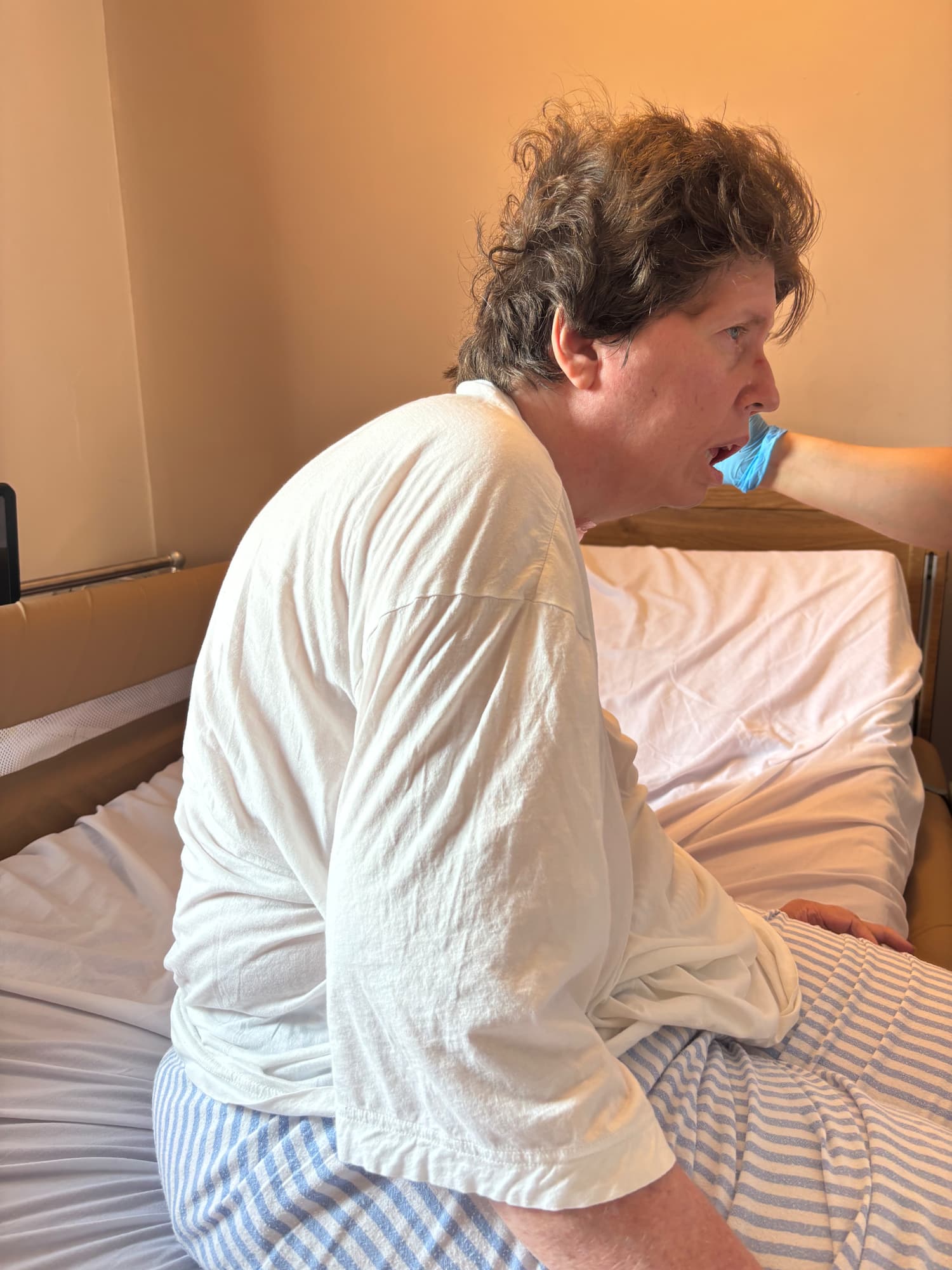 Another exciting first sittin at the end of my bed during care home physio and my eldest daughter.i was rather wobbly but i was rather pleased with myself