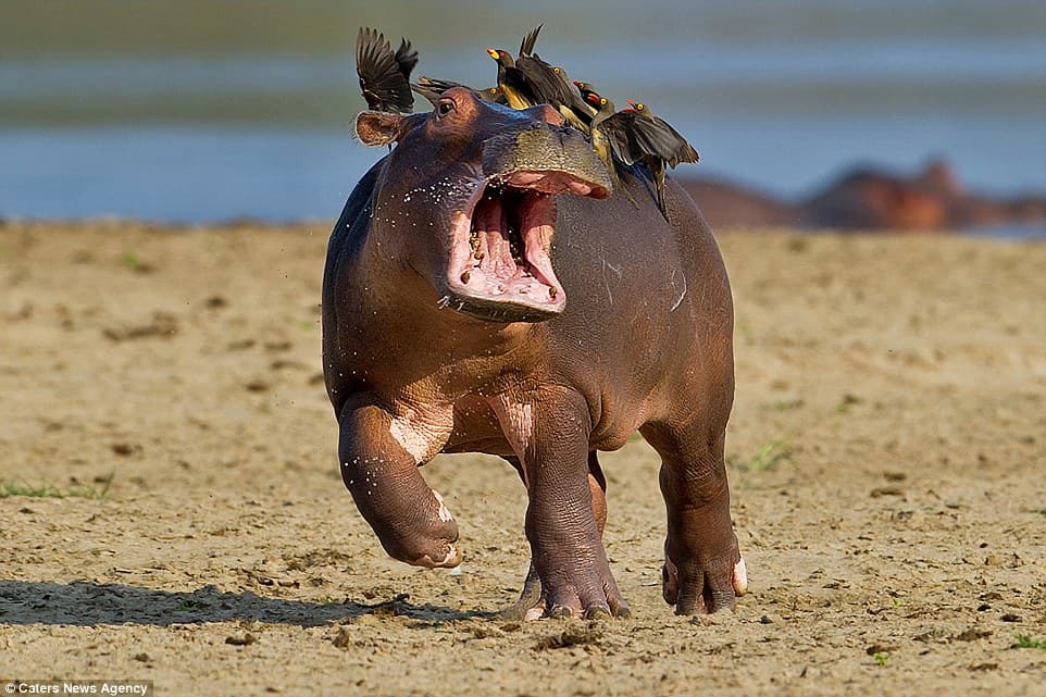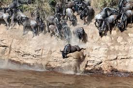 Wilbur, winifred, willy and winston white bearded gnus/wildebeest leeping across the grumeti river in tanzania into the jawa of crocodiles to get to grazing pastures across the river