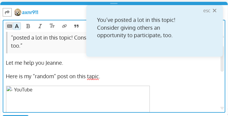 Hi Ann–Lately, I’ve been getting the message every time I post that I’ve “posted a lot in this topic! Consider giving others an opportunity to participate, too.” Are you getting this message? It shows up right where I’m working. Don’t they like us using the site?