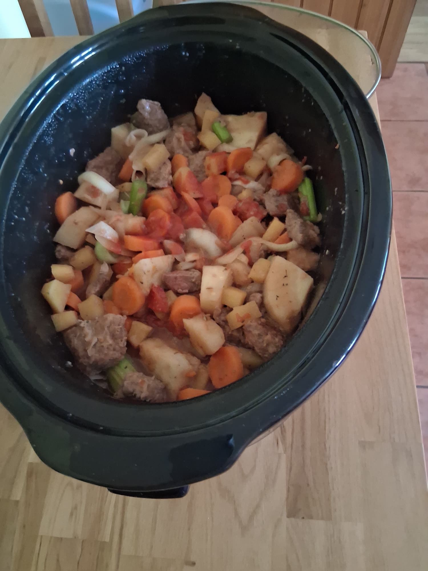 Mash potato with butter, then add some of liquor from pan, mix until smooth. Add back to veg. Open tin of tomatoes and combine with other ingredients. Put the whole back on the heat and simmer, stirring to prevent sticking as it thickens.