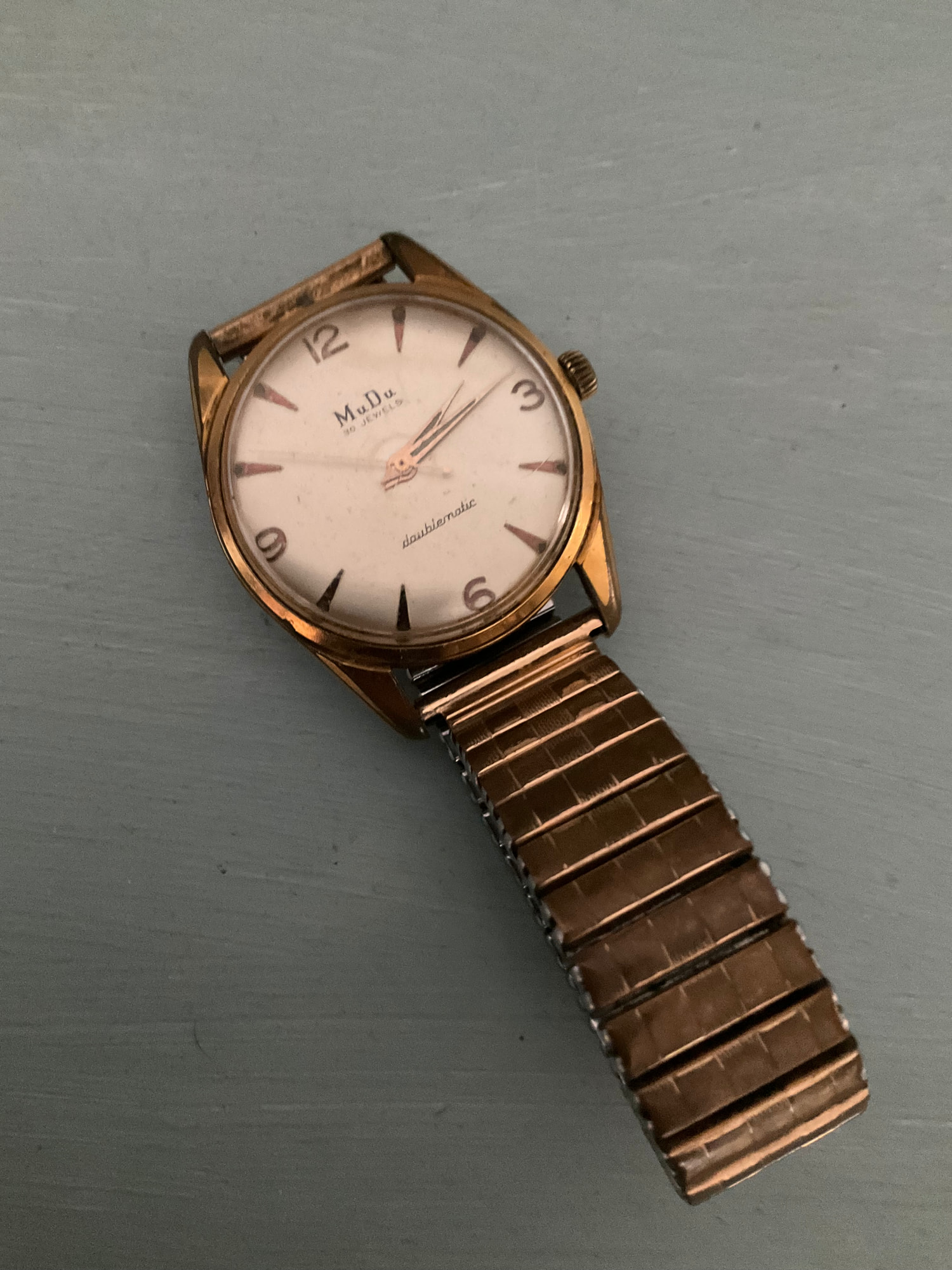 My grandfather’s watch. It’s a year younger than me, bought in 1964 from an auction of goods that had been seized by HM Customs. Left to me when he died in 1971 at the young age of 56. It still works and keeps good time, though I wouldn’t risk wearing it these days. My dad bought an identical one at the same time but as he was a chef it fell victim to the greasy, humid kitchen environment.