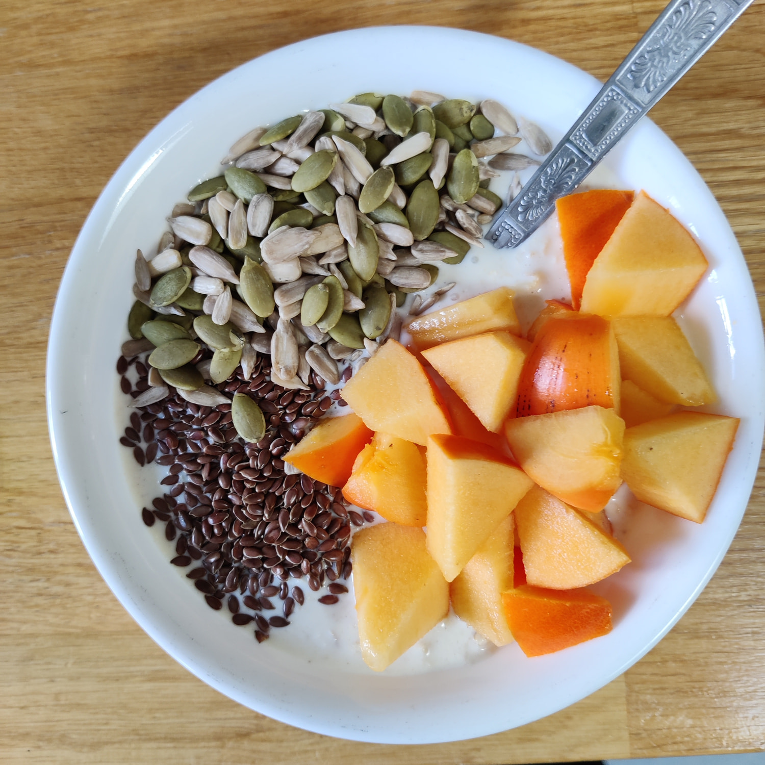 In the picture, the base is the overnight oats mix which I have further topped up with a bit more milk as it was too thick for me and toppings are persimmon (half large), sunflower and pumpkin seeds and a spoonful of roasted flaxseeds.