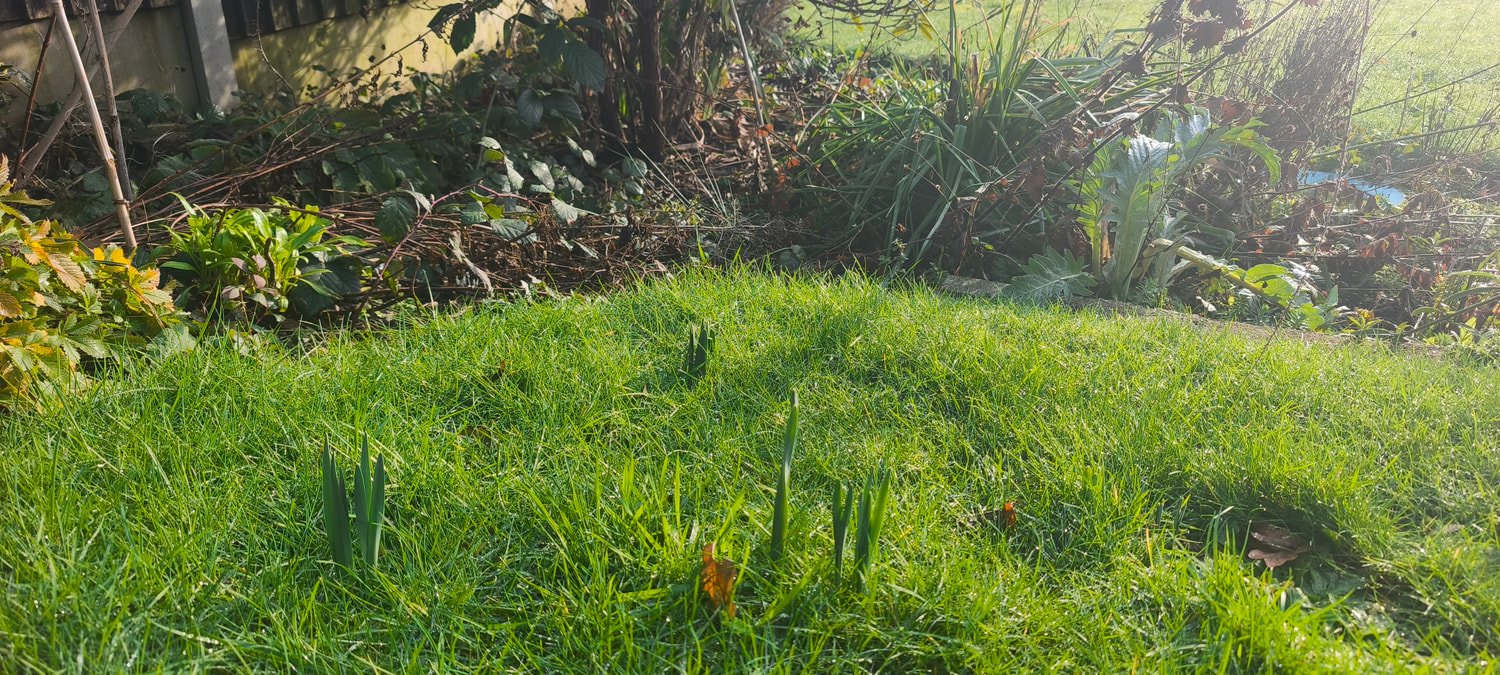 And here’s my daffies coming up, with a background of other things that have died off for the winter.